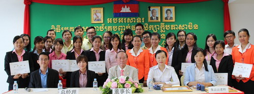6月9日上午,柬埔寨王家研究院孔子学院和柬埔寨加华银行合作的中文俱乐部第一期汉语班结束,为感谢柬埔寨王家研究院孔子学院的支持,加华银行在加华大厦20楼培训室隆重举行颁奖仪式。加华综合企业集团董事长、柬华理事总会会长方侨生勋爵(Pu Khear Se)、Mega资产管理公司总经理林丽珍(Lim Lychen)、Mega资产管理公司招聘主管林健安(Lim Kear An)、柬埔寨王家研究院孔子学院公派教师邢慧莹、朱云云老师及25名加华银行中文俱乐部的学员参加了颁奖仪式。
