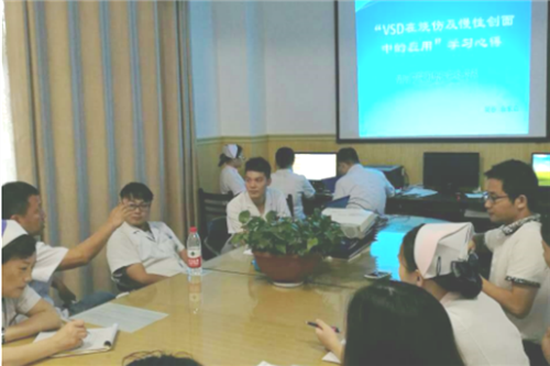 会上,余东启医师汇报了此前在庐山西海举办的国家级继续教育“VSD在烧伤及慢性创面中的应用”学习班的学习心得,向全体医护人员分享了国内外VSD最新前沿治疗经验,吴吞主治医师作重要补充和个案赏析和学习。随后,与会人员就“何种烧伤创面适宜VSD治疗”、“VSD促进褥疮糖尿病足创面肉芽组织生长”、“VSD并发症及处理”、“VSD临床护理重点”等四个问题展开了讨论。熊梅护士长结合该院烧伤科已开展的VSD技术,提出“临床护理是治疗的重要保障和补充”这一观点并引入讨论。