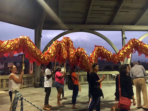 伴着皎洁的月光,孔子学院教师与萨凡纳州立大学在校师生一同舞着极具中国特色的红色长龙行走在萨凡纳市著名的旅游度假胜地泰比岛的木栈桥上,形成了一道亮丽的风景线,在沙滩上的游客们纷纷鼓掌叫好,连呼Amazing。