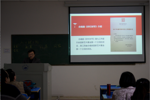 合唱曲《农忙时节》是九江市音乐类国家艺术基金第一个立项的项目,是江西省合唱类国家艺术基金第一个立项的项目。欧阳副院长介绍,近些年,我校发挥地域文化优势,推进地方传统特色文化艺术的发展和创新。一方面加强与地方合作,引进非物质文化遗产项目,已成立 “庐山文化研究中心”“青阳腔戏曲艺术中心”;另一方面建立教学实践基地,推动民间文化艺术发展创新,2010年获批江西省高校首个“非物质文化遗产研究基地”。我校艺术学院凭借赣北地区唯一本科院校的“特色化”办学优势,与地方文化部门配合,对包括本次申报项目“全丰花灯”在内的各级非遗项目都开展了挖掘、保护、传承、再创作等工作,也希望老师们多以此为启发,苦下功夫,多出成绩。