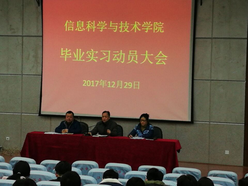 为了保证信息学院2018届本科毕业实习工作顺利进行,圆满完成实习任务,12月29日上午,九江学院信息科学与技术学院组织召开2018届本科毕业实习动员会。院长邓安远,副院长胡慧,教研科长许志国、2018届全体本科班主任以及2018届全体本科毕业生参加了会议。会议由信息科学与技术学院教研科长许志国主持。
