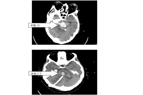患者入院时呈神志深昏迷状态,GCS4分,CT提示脑干出血。脑干出血是脑出血中最凶险的一种,一直被认为是手术禁区,患者死亡率及致残率极高,以前传统治疗均为给予药物保守治疗。近年来有些大医院开展开颅手术清除血肿,但并不能改善患者预后,没有得到广泛推广。经过与患者家属充分沟通,神经外科赵浪平主任医师带领张国斌副主任医师,周嘉敏、黄启伟主治医师,朱鹏博医师等一起为患者行“脑干出血立体定向下穿刺外引流术”。该手术具有恢复快、住院时间短、治疗费用低等优点,是一种创伤小、治疗确切、家属容易接受的治疗手段。