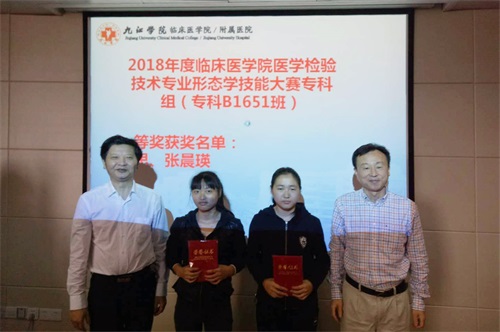 此次大赛,本科与专科层次分开设置奖项,各设一等奖2名,二等奖3名,三等奖5名,比赛内容涵盖了外周血细胞形态学、骨髓细胞形态学、尿沉渣形态、寄生虫及微生物形态等内容。赛后经过大赛组委的评比,A1541班胡俊、袁林鹏,B1551班王思、张晨瑛4名同学荣获一等奖,郭莹洁等6名同学获二等奖,胡冰怡等10名同学获三等奖。临床医学院/附属医院党委张南华书记、黄啸林副院长、检验专业负责人胡志坚副院长为获奖同学进行了颁奖。