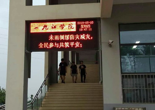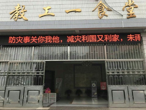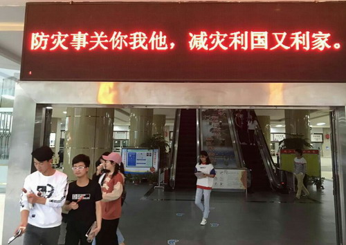 宣传以覆盖全校师生为目的,广泛利用食堂、图书馆、学生宿舍、教学楼等场所的电子滚动屏循环播放有关警示标语,提醒师生增强防灾减灾意识,提高防灾减灾技能。