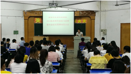 为了深入了解2018届本科毕业生的毕业实习情况和做好毕业论文答辩工作,近期,药学与生命科学学院在笃学楼204召开2018届本科毕业实习总结暨毕业论文答辩动员大会。院党委书记鲍海鸥、副院长张小谷、余敬谋及教务科负责人张良慧、王萍兰,学生科负责人过七根以及2018届本科班班主任和2018届全体本科生到会参加。本次大会由院长助理吴家忠主持。