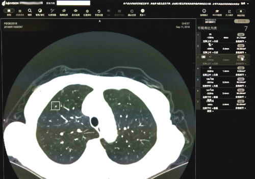 这款由推想科技提供的软件结合临床医学院/附属医院最先进的 256排512层高端螺旋CT扫描的肺部图像,以其高性能的并行运算能力,通过测量CT值识别出实性、磨玻璃及钙化结节并同时显示所有结节的大小、体积。有了该软件的辅助,再小的结节也不易漏诊。影像科医生对检测的结节进行分析,反馈至软件中标记假阴性的结节和取消假阳性结节的标记。此外,它可通过对影像组学的自我深度学习,提高对图像全信息识别利用的诊断准确性;并且它的知识经验会随着病例增多不断自我优化,从而不断降低漏诊率、误诊率。