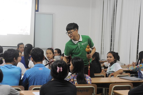 活动开始,王奕翔老师给学生们介绍了孔子的生平,以及孔子在中国的影响力。他巧用一组数字“2569、3000、72”分别介绍道,“今年是孔子诞辰2569年,他有3000多名学生,其中贤者72人”。接着王奕翔老师给学生们讲解了孔子的主要思想“仁”和“礼”,他告诉学生们“仁”就是要时常怀着一颗仁爱的心来对待别人,并用中柬两国礼仪作对比来讲解“礼”。随后王老师带领学生们学习了作揖礼和抱拳礼,并与学生们积极互动,互相行礼以感受中国传统礼仪文化。王奕翔老师还向学生们讲解了孔子的名言“三人行,必有我师焉”、“有朋自远方来,不亦乐乎”,并希望在座的学生们都要互相学习,努力提高自己的汉语水平。