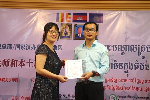 10月29日下午四时,2018-2019学年孔子学院总部/国家汉办柬埔寨地区公派教师和本土教师培训于柬埔寨皇家科学院孔子学院三楼会议厅圆满闭幕。本次培训为期两天,北京语言大学刘谦功教授和北京师范大学孙红娟副教授作为培训主讲师,来自柬埔寨全国各省的80名本土汉语教师、21名公派教师参与培训,32名汉语教师志愿者参与旁听。