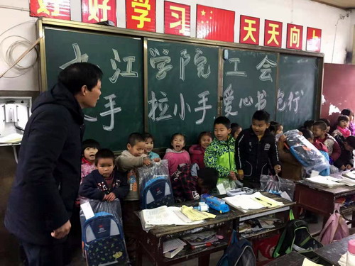 12月7日上午,伴随着绵绵冬雨,凛凛寒风,遵照校领导的指示,校工会主席金葆金和马丽君老师、王若宇老师一同前往我校扶贫点武宁县官莲乡东山村小学,为该校的25名学生送去了充满温暖的爱心书包。