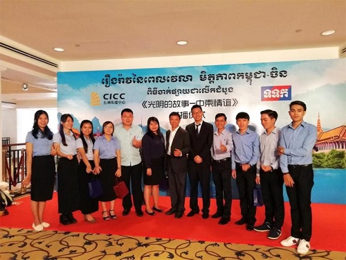 首播仪式结束后,柴克清院长和苏碧娜院长带领柬埔寨孔子学院的老师学生们参观了纪念60周年建交绘画作品展和片会,并进行合影留念。(文/黄书 摄/刘振)