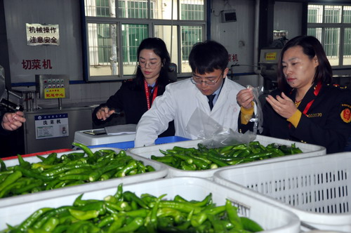 活动现场,检测人员从九江学院学生食堂取样部分品种的蔬菜作为检测标的。据检测人员介绍,食品安全快速检测设备可对食品农药残留、二氧化硫、亚硝酸盐、吊白块、过氧化值等20多项食品指标进行检测,且准确度高,操作简便。食品安全快速检测设备的投用,告别了以往食品安全执法检查用手摸、凭肉眼、靠经验的做法,提高了食品安全监管的靶向性和针对性。食品是否安全,通过实验室检测周期太长,不能让消费者及时掌握不合格食品信息。而食品安全快速检测仪正好弥补了实验室检测周期长的不足。经过抽样检测,九江学院参检样品全部合格。市场监督局工作人员和众多媒体还一起走进九院食堂后厨,检查食堂各项记录,参观了我校食堂的仓储中心和蔬菜配送中心,对我校饮食服务中心心系师生饮食安全的一系列做法表示赞赏并提出了很多好的建议。