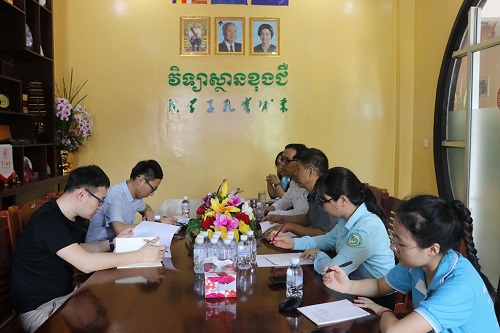 项目主管苏文鹏老师首先对柴院长的热情接待表示感谢。随后,双方针对柬埔寨企业衡量面试者汉语水平的标准进行了讨论。黄青山老师提出,如今来柬投资的国内企业不断增加,汉语人才供不应求。企业面试往往仅以应聘时的沟通交流水平为标准,汉语口语流利即可录取,这样的方式往往无法正确判断学生的汉语水平。苏文鹏老师建议:“我们应该向各商会、企业普及HSK/HSKK考试的相关内容,强调该项考试的重要性,推进企业招聘以HSK/HSKK考试证书等级为参考标准招聘汉语人才,优先录取拥有相应水平等级证书的面试者。”