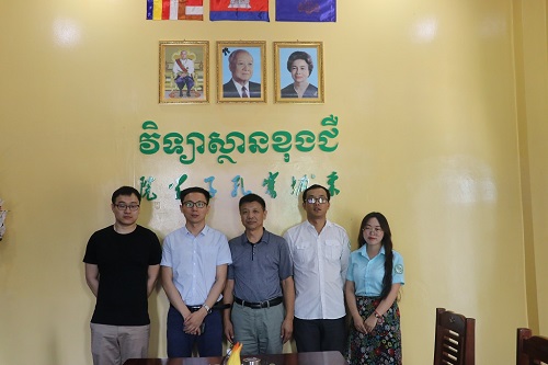 4月25日上午,孔子学院总部/汉考国际项目主管苏文鹏、市场专员赵斌二人莅临柬埔寨皇家科学院孔子学院调研指导,柬埔寨皇家科学院孔子学院中方院长柴克清、公派教师户社芳老师、黄青山老师、汉语教师志愿者黄书在孔子学院一楼会议室热情接待来宾并展开友好会谈。