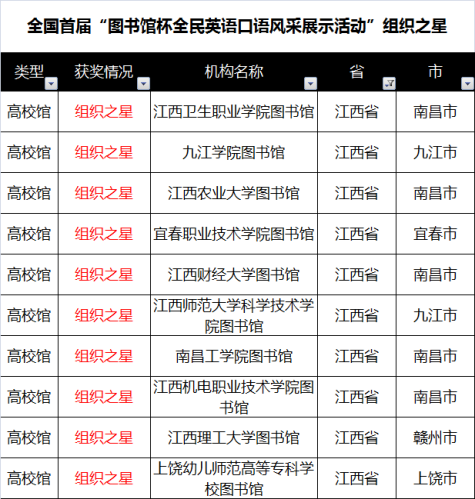 我校图书馆因在此次活动中组织得力,荣获全国首届“图书馆杯全民英语口语风采展示活动”组织之星称号。