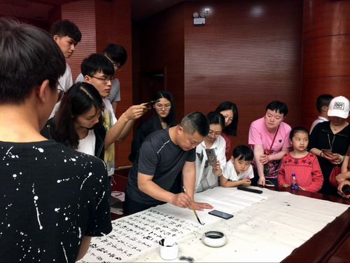 互动环节,曹端阳先生现场书写《兰亭集序》,吴若飞老师诵读此帖。一时间现场人头攒动,现场沸腾,观众纷纷前往观摩曹先生笔走龙蛇,惊叹于大师挥毫之行云流水。让人印象深刻的是,一位7岁的小姑娘竟然能流畅地背诵《兰亭集序》,中华传统诗词的魅力传承可见一斑。令人振奋的是,曹先生慷慨意气,一笔挥就“蝶湖沙龙”四个大字,连同《曹端阳小楷四书》3册一起赠送图书馆。为表谢忱,图书馆向嘉宾回赠收藏证书及纪念品。