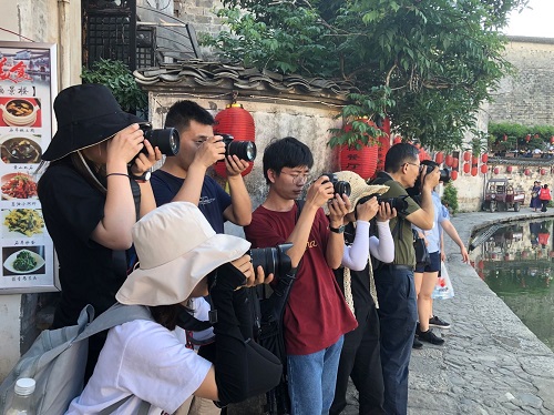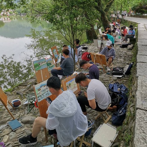 西递、宏村为世界文化遗产,也是国家AAAAA级旅游景区,是安徽南部民居中最具有代表性的两座古村落,以世外桃源般的田园风光、保存完好的村落形态、工艺精湛的徽派民居和丰富多彩的历史文化内涵而闻名天下,被誉为"画中的村庄"。在各位老师的安排下,同学们来到了心之向往的地方,看到了宏村古色古香的建筑,找到了渴望已久的拍摄素材,拓展了写生素材范围及实践捕捉绘画素材的创作能力。这五天,同学们在西递宏村景区内进行了紧张而有序的自由拍摄活动,他们先后拍摄了屏山、影视村、南屏等景点,拍摄了大量的照片,捕捉到光与影的瞬间。同时,同学们还将宏村美丽的图景集于自己的笔尖,绘出眼中宏村的样子。