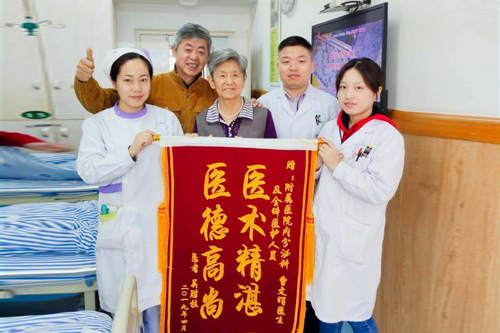 患者吴婆婆,81岁,之前曾在外院进行治疗,出院后不久出现胸闷、头晕、乏力等不适,后来到临床医学院/附属医院就诊。患者既往诊断为2型糖尿病伴多个并发症,合并肾功能不全,入院时查血钾:7.76mmol/L,脑钠素:856.81pg/mL,考虑患者合并心功能不全及肺部感染,在告知患者及家属病情危重的同时,附内分泌科主任虞建新、副主任医师董俊、医师曹文娟等立即给予抗感染、利尿纠正心功能不全、胰岛素配葡萄糖降血钾等综合处理,将患者病情逐渐控制平稳。治疗效果显著,出院当天,患者及其儿子送来一面锦旗,以表对科医护人员的感激之情。