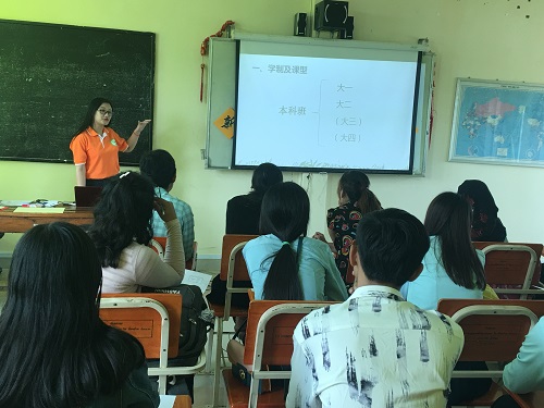 随后,志愿者教师穆晓彤对新学期课程设置进行了详细介绍。穆老师针对本科班和短期班两个不同班型分别做了说明,尤其强调了课时安排和上课时间上的变动。新的教学方案将以汉语综合课为主,同时设置汉语技能专项训练课程,包括听、说、读、写四个部分,旨在以交际为中心,培养综合型汉语人才。最后,穆晓彤老师还对新学年中文系的课堂规范提出了新要求,制定了清晰明确的课堂管理制度。严格的课堂管理制度将帮助学生把更多的精力在汉语学习集中上,力求让学生的汉语水平得到快速提高。
