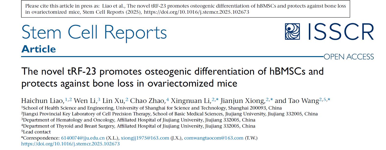 近日,细胞精准治疗江西省重点实验室骨质疏松团队在Cell子刊《Stem Cell Reports》杂志(中科院1区Top期刊)发表了题为《The novel tRF-23 promotes osteogenic differentiation of hBMSCs and protects against bone loss in ovariectomized mice》的研究论文。该研究首次揭示了一种来源于tRNA的新型非编码小RNA在调控人骨髓间充质干细胞(hBMSCs)成骨分化和缓解骨质疏松过程中的关键作用及其分子机制,为骨质疏松的临床治疗提供了新的理论依据和潜在的治疗靶点。