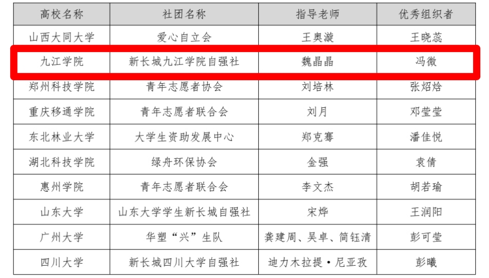 此次获评全国优秀社团,既是对我校社团公益实践能力与组织水平的高度认可,也是对自强社全体成员深耕公益、践行初心的莫大鼓舞。未来,新长城九江学院自强社将以此为契机,继续坚守公益使命,凝聚青年力量,深耕可持续发展校园实践,不断探索绿色公益新路径,为建设低碳校园、助力社会可持续发展注入青春动能。